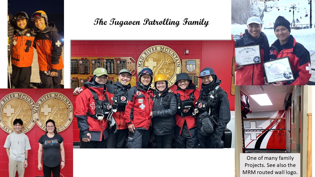 Many of us refer to MRM-SP as our “patrol family”, especially as the years go by and we have spent so much time together, encouraged each other, provided support during tough times, shared hard work as well as laughter. Sometimes at least a portion of your patrol family is also your life family and our most recent extended family is the Tugaoens. Dad Justin and Mom Janice are joined by their four sons: Jonah, Julian, Jaden, and Josiah. They are boarders, skiers, telemarkers. They are candidates, patrollers, and senior alpine patrollers. They are also artistic and sharing – gifting MRM patrol with routed wall hangings and painted vibrancy. We are lucky to have them share their talents with us.