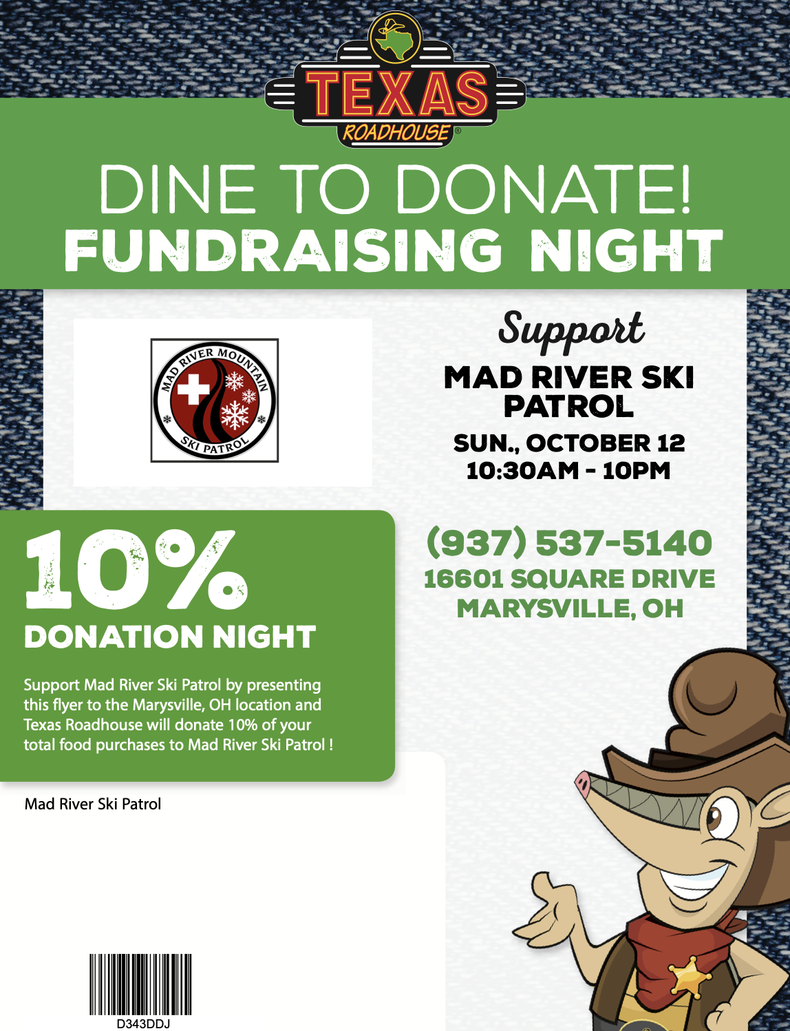 On Sunday, October 12th we are partnering with Texas Roadhouse in Marysville, Ohio, to hold a special fundraising event from 10:00 AM to 10:00 PM. During that time, a portion of their sales will go directly to support the Mad River Mountain Ski Patrol — helping us continue training, education, and providing top-notch safety on the slopes.